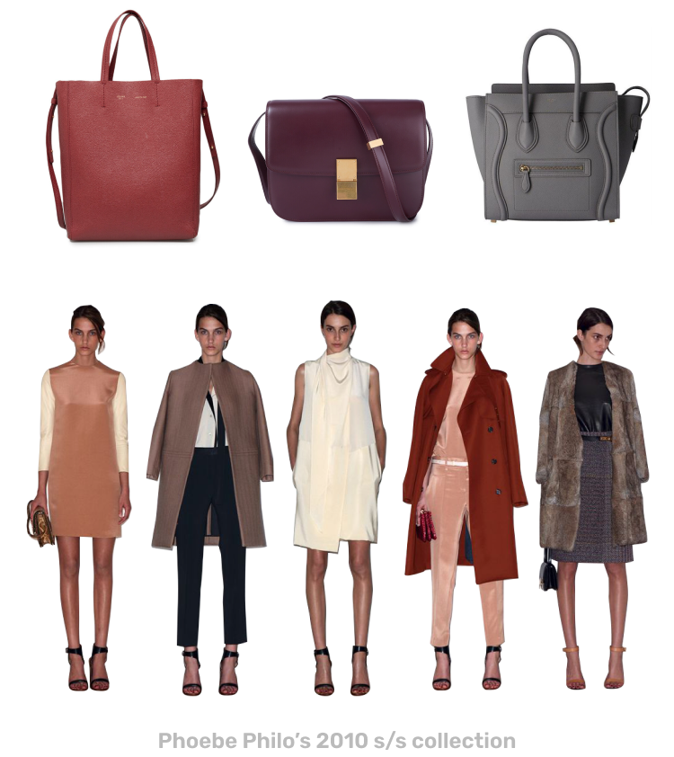 특히 첫 컬렉션은 아직까지도 회자될 정도로 많은 인상을 남겼는데, 바로 지금의 셀린느를 떠올리면 떠오르는 카바스백, 러기지백, 클래식박스 등 실용성을 겸비한 가방들이 등장했기 때문입니다. 러기지백은 1970년대 셀린느의 빈티지 여행 가방에서 영감을 받아 피비 파일로가 재해석한 것으로 정방형의 기본 형태에 양 옆 날개가 펼쳐진 듯한 실루엣은 로고나 브랜드의 디테일 없이도 한 눈에 셀린느 제품임을 알 수 있는 트레이드 마크가 되었습니다. 로고를 강조하던 다른 명품 브랜드들과는 달리 특유의 형태가 주목되는 디자인으로 21세기 잇백 시리즈의 시작이 되었습니다. 이후 여러 유명 패션브랜드에서 박시한 형태의 위에서부터 사다리꼴, 날개가 달린 것 같은 비슷한 가방을 선보였고 이런 디자인의 모티브가 된 트라페제백 디자인을 처음으로 선보인 피비 파일로의 패션계 영향력이 어땠는지 가늠할 수 있습니다.